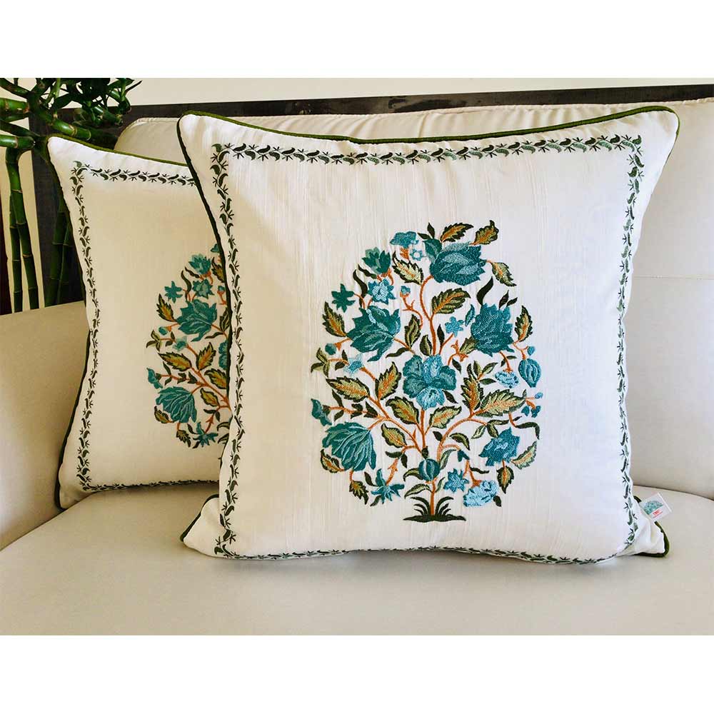 Cushion Covers(TSHEGFB02L), NOOR- Embroidered Cotton Silk Cushion Cover- Pastel Blue & Green- Set of 2, Cushion Covers - EL15306