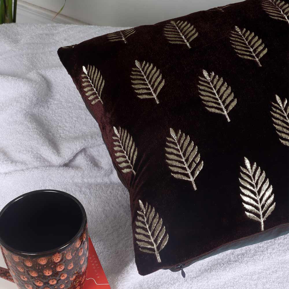 Cushion, Palm Decorative Cushion Covers, Exclusive Zari Embroidered Design Velvet Living Room Cushion Covers, 16x16inch Brown Sofa Cushion Cover, Cushion - EL15262