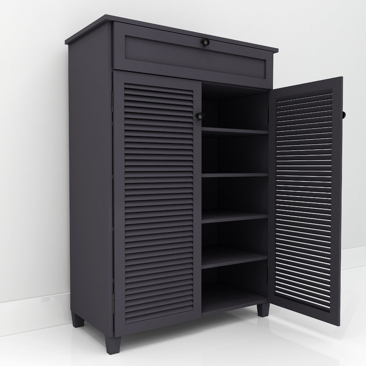 The is a dark grey shoe cabinet that features slat doors, providing a stylish and functional storage solution for your footwear. The cabinet includes a spacious drawer at the top for additional storage, making it perfect for keeping your entryway organized. The slat design allows for ventilation, helping to keep your shoes fresh. This piece is an excellent addition to any home seeking a blend of practicality and modern design.