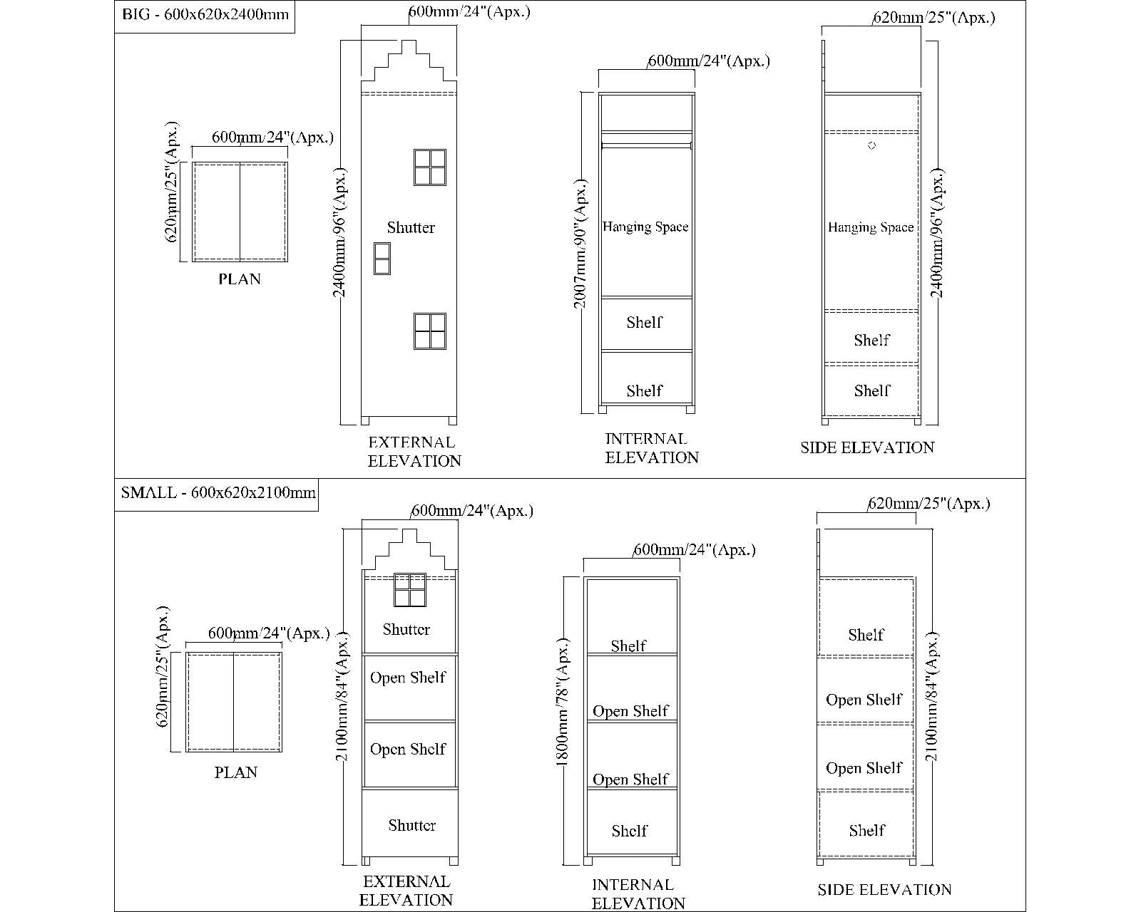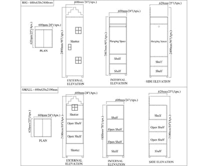 | Dimensions | Big - 600x620x2400 mm, Small - 600x620x2100 mm |