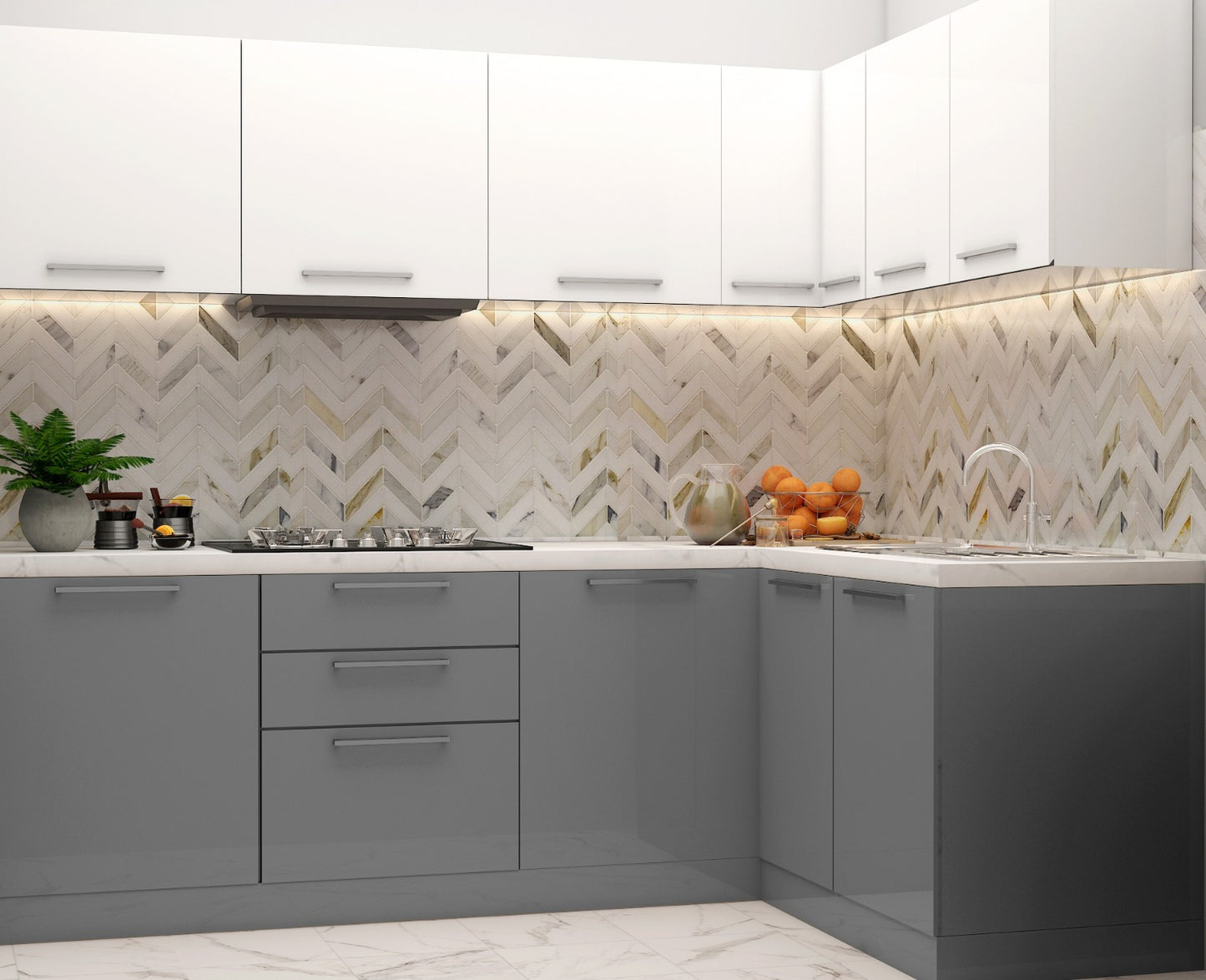 Kitchen, modular kitchen, acrylic finish modular kitchen, Luxurious kitchen, L shape kitchen, hi gloss finish kitchen, grey and white kitchen, Kitchen-IM- 8002